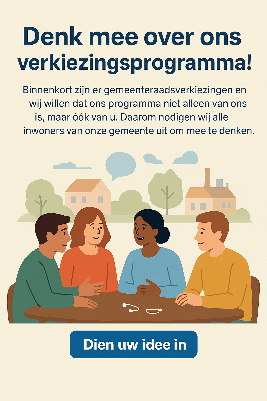 Op 18 maart 2026 zijn er gemeenteraadsverkiezingen en wij willen dat ons programma niet alleen van ons is, maar óók van u. Daarom nodigen wij alle inwoners van onze gemeente uit om mee te denken.
